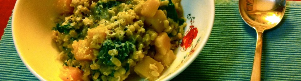 Forty minutes, and resting on the stove for a few minutes, did the trick. The barley absorbed all the liquid and was fully cooked—chewy with that funny snap between the teeth. The Parmesan cheese and the tomato in my broth added a nice richness (dare I say umami?) The squash wasn’t as sweet as I’ve had it, but it worked for this savory dish.